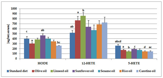 Contents of selected fatty acid metabolites in serum of rats supplemented with edible oils (ng/mL serum). Data were expressed as mean values ± standard error of mean. Bars with the same superscript (a, b, c, or d) above referring to one metabolite are significantly different (p < 0.05).