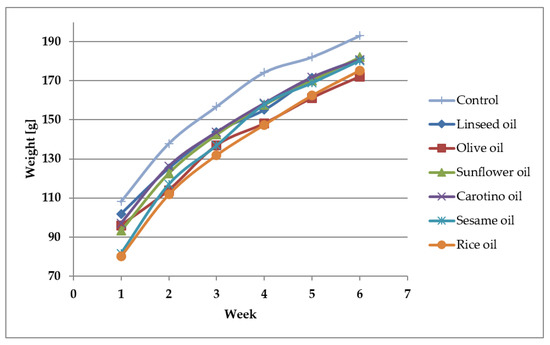 The growth rate of rats supplemented with studied oils was depicted in the Figure 4. It was observed the supplementation slowed down the rat growth through 4 weeks of experiment, compared to the control group. The smallest increase of body weight was observed in the olive oil and linseed oil supplemented groups, whereas the highest was observed in the sesame oil fed group followed by the group receiving the rice oil (Table 6, Figure 5).