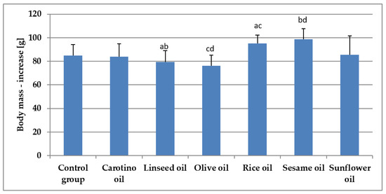 Body mass increase (g) of rats supplemented with selected oils. Bars with the same superscript (a, b, c, or d) above are significantly different (p < 0.05).