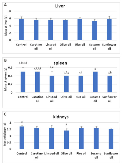 Organ weights of rats supplemented with selected oils (A—mass of liver; B—mass of spleen; C—kidneys). Bars with the same superscript (a–i) above are significantly different (p < 0.05).