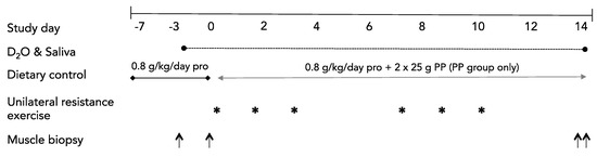 Study schematic. PP, potato protein. * indicates a unilateral resistance exercise session. ↑ indicates one muscle biopsy sample.