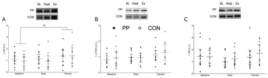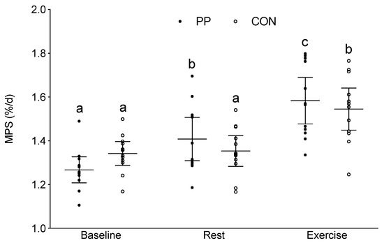 Dietary variables (fat, carbohydrate, and protein intake) were compared using an independent sample t-test. MPS and western blotting analyses were compared using a 2-way analysis of variance (ANOVA) with between-persons (group: PP versus CON) and within-person (condition: Baseline, feeding [Rest], feeding + exercise [Exercise]) factors. All significant interactions from the ANOVA analysis were further tested by a post-hoc using Tukey’s post hoc test. Significance was set at p ≤ 0.05. All statistical analyses were completed using SPSS (IBM SPSS Statistics for Mac, version 21; IBM Corp., Armonk, NY, USA). Graphical representations of data are as individual values with the horizontal line represents the mean, and the whiskers representing the 95% confidence interval. All other values, unless otherwise noted, are expressed as means ± standard deviation.