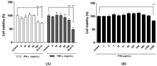 Cell viability at various treatment concentrations of interferon (IFN)-γ, tumor necrosis factor (TNF)-α, and Pyropia yezoensis extract (PYE) on HaCaT cells. Cells were incubated with the indicated concentration of each cytokine (IFN-γ (I) and TNF-α (T)), alone or (I+T) combined for 24 h (A). HaCaT cells were treated with various treatment concentrations of PYE for 24 h (B). Cell viability was then determined by the 3-(4,5-dimethylthiazol-2yl)-2,5-diphenyl-2H-tetrazolium bromide (MTT) assay. Results are expressed as means ± standard deviation (SD) of triplicate experiments. Statistical comparisons of different treatments were performed using one-way analysis of variance (ANOVA) with Tukey’s multiple comparison test. Note: *** p < 0.001 compared with the control group.