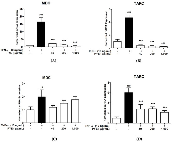 To investigate the effect of PYE on pro-inflammatory chemokine (TARC and MDC) production by TNF-α/IFN-γ-stimulation, HaCaT cells were treated with PYE and IFN-γ or TNF-α for 24 h, and the mRNA expression of MDC and TARC chemokines was analyzed using real-time qPCR. As shown in Figure 2A,B, PYE (40 to 1000 μg/mL) significantly inhibited the mRNA expression of IFN-γ-stimulated TARC and MDC in a dose-dependent manner. Similarly, PYE suppressed the TNF-α-stimulated mRNA expression of TARC, but weakly inhibited MDC (Figure 2C,D). These results suggest that PYE can modulate the mRNA expression of the pro-inflammatory chemokines TARC and MDC.