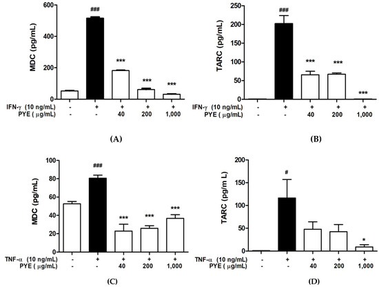 We investigated the effect of PYE on the production of TARC and MDC chemokines induced by IFN-γ or TNF-α. HaCaT cells were incubated with the medium alone or IFN-γ or TNF-α in the presence or absence of PYE at indicated concentrations. The levels of TARC and MDC in the culture medium supernatant were determined by ELISA (Figure 3). Even at 10 ng/mL, IFN-γ increased the secretion of TARC from a basal level of 1 pg/mL to 202.43 ± 36.78 pg/mL (p < 0.001) and MDC from a basal level of 52.64 ± 4.47 to 516.1 ± 13.19 pg/mL (p < 0.01). TNF-α stimulation increased the secretion of TARC from a basal level of 1 pg/mL to 116.41 ± 70.56 pg/mL (p < 0.05). Additionally, as a result of mRNA expression, the secretion of these chemokines in HaCaT cells was significantly inhibited by PYE compared to the IFN-γ- or TNF-α-stimulated group (p < 0.001). The results showed that PYE inhibited the release of IFN-γ- and TNF-α-stimulated pro-inflammatory chemokines TARC and MDC.