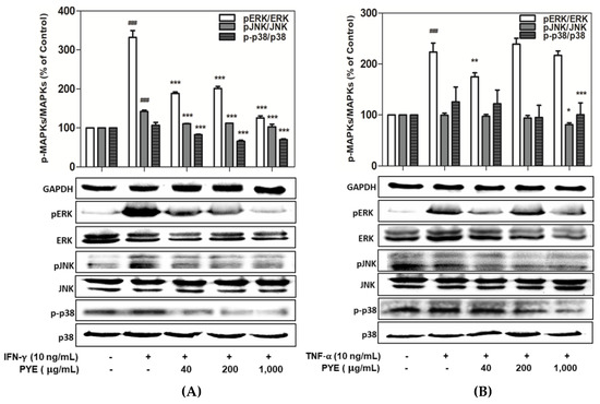 Effect of PYE on the mitogen-activated protein kinase (MAPK) signaling pathway in HaCaT cells. Protein was isolated from cells treated with IFN-γ (A) or TNF-α (B) in the absence or presence of varying concentrations of PYE for 24 h. Phosphorylation levels of extracellular signal-related kinase (ERK), c-Jun N-terminal kinase (JNK), and p38 determined using Western blot analysis. Equal amounts of protein loading were checked using total protein and housekeeping protein GAPDH antibodies. Relative levels of p-ERK, p-JNK, and p-p38 were calculated using Image Lab. Values are means ± standard deviation (SD) of independent experiments. Note: ### p < 0.001 control group vs. the IFN-γ or TNF-α (10 ng/mL)-treated group, and * p < 0.05, ** p < 0.01, and *** p < 0.001 IFN-γ or TNF-α (10 ng/mL)-treated group vs. PYE co-treated group.