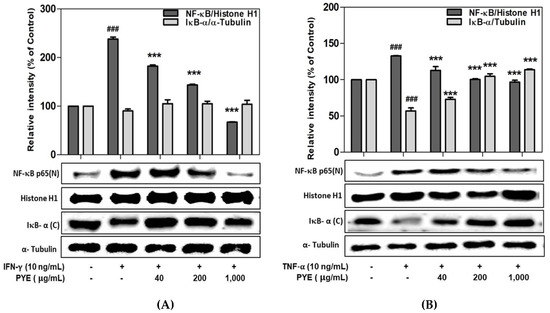 Effect of PYE on the translocation of nuclear factor NF-kB/IkB-α induced by IFN-γ (A) or TNF-α (B) in HaCaT cells. HaCaT cells were incubated with various concentrations of PYE (40–1000 μg/mL) and stimulated with IFN-γ or TNF-α (10 ng/mL). IκB-α (C) in cytosol extract; NF-κB (N) in nuclear extract. Expression of NF-κB and IκB-α was determined using Western blotting. Densitometry analysis presented as the relative intensity of housekeeping proteins was used as a loading control. Data are means ± standard deviation (SD) of independent experiments. Note: ### p < 0.001 control group vs. the IFN-γ or TNF-α (10 ng/mL)-treated group, and *** p < 0.001 IFN-γ or TNF-α (10 ng/mL)-treated group vs. PYE co-treated group.