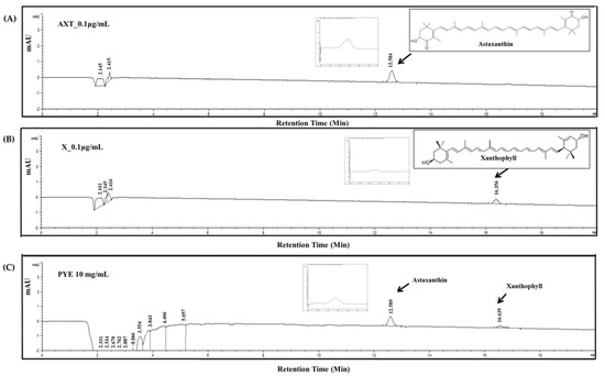 The representative chromatograms of (A) astaxanthin (AXT) standard at 0.1 μg/mL, (B) xanthophyll (X) standard at 0.1 μg/mL, and (C) Pyropia yezoensis extract (PYE) at 10 mg/mL detected by high-performance liquid chromatography (HPLC) with a diode-array detector (DAD) at 470 nm. The flow rate was 1.0 mL/min, and the sample injection volume was 50 μL.