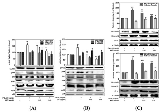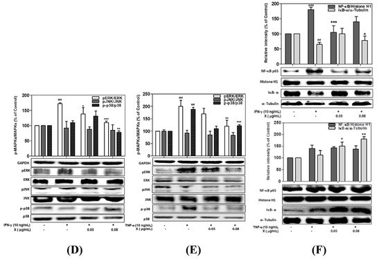 Effects of astaxanthin (AXT) and xanthophyll (X) on the MAPKs and NF-κB/IκB-α signaling pathway in IFN-γ or TNF-α-treated HaCaT cells. HaCaT cells were incubated with two concentrations of AXT and X (0.05–0.08 μg/mL) and stimulated with IFN-γ or TNF-α (10 ng/mL). Quantitative band-intensity for p-MAPKs (A,B,D,E) and p- NF-κB/IκB-α (C,F) were analyzed by densitometry, normalized to the level of GAPDH, histone H1, or α-tubulin, and calculated as a percentage of the basal response. Data are means ± standard deviation (SD) of independent experiments. Note: Significant differences # p < 0.05, ## p < 0.01, and ### p < 0.001 from control vs. the TNF-α/IFN-γ-(10 ng/mL)-induced group, and * p < 0.05, ** p < 0.01, and *** p < 0.001 IFN-γ or TNF-α (10 ng/mL)-induced group vs. astaxanthin and xanthophyll treated group.