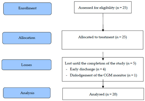 From the total number of 25 patients initially recruited to this pilot study, 4 patients dropped out due to early discharge from hospital, and 1 patient dislodged their CGM, resulting in an incomplete data set. Figure 1 illustrates the flow of participants in the study.