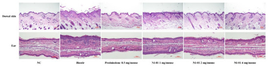 Effect of NI-01 on histological features of dorsal skin and ear lesions in house dust mite treated NC/Nga mice. Dorsal skin and ear tissue were fixed with 4% paraformaldehyde, embedded in paraffin and cut into thin sections. Histological features of lesions were determined with hematoxylin and eosin (×20). Prednisolone was used as a positive control. NC; normal control, Biostir; Biostir-AD® group.