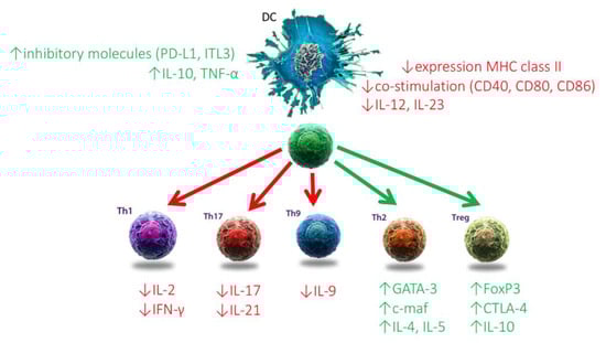 1,25-(OH)2D3 can both directly and indirectly influence T-lymphocytes. The indirect pathway involves the modulation of the T-lymphocyte stimulatory function of antigen-presenting cells (APC). In monocytes and macrophages, 1,25-(OH)2D3 downregulates surface expression of MHC class II and co-stimulatory molecules (such as CD40, CD80, and CD86), and thus decreases antigen presentation [81]. 1,25-(OH)2D3 has the same effect in DCs and also inhibits their production of IL-12 and IL-23, besides a stimulation of the release of IL-10 and macrophage inflammatory protein-3α (MIP-3α) [82]. Taken together the indirect effect of 1,25-(OH)2D3 (especially on DCs as they are believed to be its central target) is a modulation of T-lymphocyte response. There will be a decrease in autoreactive T-lymphocyte proliferation, induction of both early (annexin V+/PI-) and late (annexin V+/PI+) apoptosis of autoreactive T-lymphocytes, and even a rise of Tregs [49,83]. The DC derived cytokines will alter the Thelper (Th)–lymphocyte balance from a Th1 and Th17 predominance towards a Th2 phenotype (Figure 1) [82,84].
