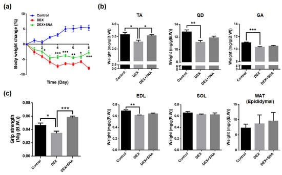 To investigate the effects of SNA on DEX-induced muscle atrophy, 10-week-old C57BL/6 male mice were orally administered SNA for a total of 10 days, i.e., (20 mg/kg), two days before the administration of DEX (20 mg/kg, i.p. daily for 8 days). As shown in Figure 1a, DEX administration reduced body weight. However, SNA treatment (DEX+SNA group) significantly inhibited this reduction in body weight. We measured the weight of each type of muscle tissue, including the TA, QD, GA, EDL, and SOL muscles, as well as epididymal adipose tissues. DEX administration significantly decreased the muscle tissue weight of TA, QD, GA, and EDL muscles in the DEX group compared to the CON group. The weight of all of these muscle tissues appeared to be increased on SNA treatment, most significantly in the TA muscle, compared with that of the DEX group (Figure 1b). However, the weight of epididymal adipose tissues did not significantly differ among the three experimental groups (Figure 1b). To investigate whether SNA treatment improved muscle function, we compared the forelimb grip strength after 10 days of treatment with SNA. The grip strength was significantly reduced in the DEX group; comparatively, the grip strength was significantly increased in the DEX+SNA group (Figure 1c).