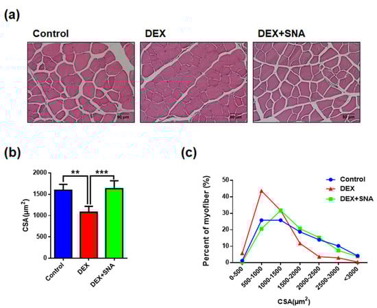 The CSA of myofibers was reported to be reduced in dexamethasone-induced muscle atrophy [21]. Therefore, we evaluated if SNA treatment affected the size of the myofibers. TA muscle sections was stained with H&E and the size of myofibers were analyzed. As shown in Figure 2a,b, approximately 30% reduction in mean CSA was observed in the DEX group compared with the CON group. Treatment with SNA significantly increased the CSA compared to the DEX group. In terms of myofiber distribution, the size of myofibers in the ranges of 500–1500 and 1500–3000 µm2 in the CON group was approximately 51.6% and 42.8%, respectively, and their proportions changed to approximately 75.2% and 18.2% upon DEX administration. In the DEX+SNA group, the myofiber in the ranges of 500–1500 and 1500–3000 µm2 was approximately 52.3% and 43.4%, respectively (Figure 2c). This reduction in mean myofiber size shows that DEX-induced muscle atrophy was significantly inhibited by SNA treatment.