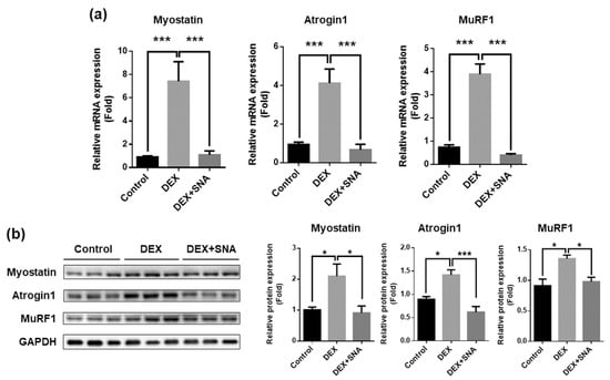 To confirm the effect of SNA on the expression of myostatin, atrogin1, and MuRF1 in vitro, we treated C2C12 myotubes with 10 µM SNA in the presence of DEX for 12 h. Myostatin, atrogin1, and MuRF1 mRNA and protein expression were then examined. SNA treatment significantly inhibited DEX-induced myostatin, atrogin1, and MuRF1 mRNA and protein expression (Figure 4a,b).