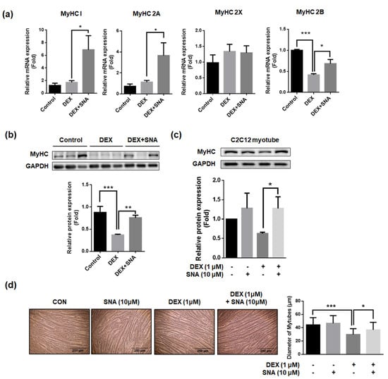 MyHC is a major component of contractile proteins which acts as a motor protein in muscle tissues [22]. Previously, MyHCs have been associated with muscle thickness, muscle contractile speed, endurance, and strength [22,23,24]. Therefore, the mRNA expression of four isoforms of MyHC (MyHC 1, 2A, 2X, and 2B) were assessed in the TA muscles of the mice (Figure 5a). DEX-administration did not change mRNA expression of MyHC 1, 2A, and 2X, but significantly decreased MyHC 2B mRNA expression. SNA treatment significantly increased the mRNA expression of MyHC 1, 2A, and 2B compared with that in DEX-administered mice. When we assessed the MyHC protein expression in the TA muscle, protein levels were found to have decreased in the DEX-administered mice, and this reduction was significantly inhibited by SNA treatment (Figure 5b). Similarly, we found that the MyHC protein expression (Figure 5c) and myotube diameter (Figure 5d) decreased upon DEX treatment and SNA treatment increased MyHC protein expression in DEX-treated C2C12 myotubes.