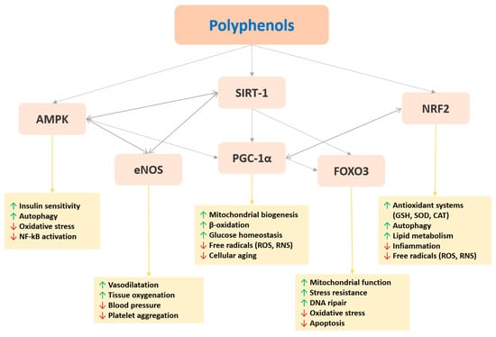 - Ayissi, V.B.; Ebrahimi, A.; Schluesenner, H. Epigenetic effects of natural polyphenols: A focus on SIRT1-mediated mechanisms. Mol. Nutr. Food Res. 2014, 58, 22–32. [Google Scholar] [CrossRef] [PubMed]