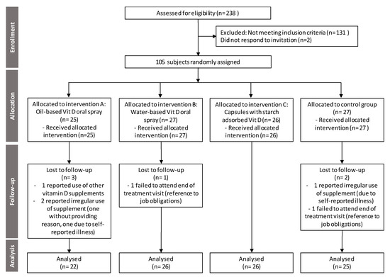 A CONSORT (Consolidated Standards of Reporting Trials) flow diagram showing trial design and subjects’ assignment and progression through the trial is presented in Figure 1. Initially, eligibility of 238 healthy adults was screened for 25-OH-VitD serum levels, ranging in age from 18 to 64 years. Among those, 107 subjects with suboptimal serum 25-OH-VitD concentration were invited to collaborate in the trial, two of those did not respond, and therefore, 105 were enrolled in the trial and assigned to one of four groups using stratified randomization by gender and baseline 25-OH-VitD levels. Trial was conducted in Slovenia during wintertime; the study started in January 2019 (signed consent, screening and baseline serum 25-OH-VitD concentration, randomization, and start of treatment) and ended in March 2019 (compliance assessment and measurement of serum 25-OH-VitD concentration). Consistent with the principles laid down in the Declaration of Helsinki, all subjects provided signed informed consent before recruitment. No adverse events were reported.