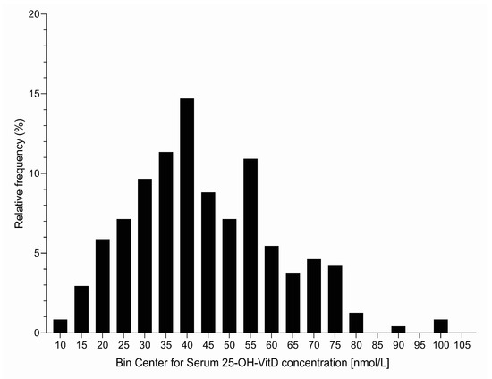 Histogram presenting distribution of wintertime serum 25-OH-Vitamin D concentrations in subjects included to screening (N = 238, February).