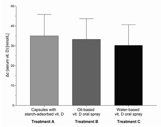 The data were processed and analyzed using Stata Statistical Software, Release 15 (StataCorp LLC, College Station, TX, USA), Microsoft Excel (Microsoft Corp., version 16.0.12325.20280, Redmond, WA, USA), and GraphPad Prism (GraphPad Software, version 8.2.0., San Diego, CA, USA). Descriptive characteristics as well as the proportions of participants with different levels of 25-OH-VitD are presented for all participants and per treatment. Analyses were conducted using the per-protocol principle. For a comparison of vitamin D changes between different formulation and control, a two-way ANOVA with Bonferroni’s multiple comparisons post hoc test was used. Logistic regression analysis was used to determine the significant differences in the mean increase in serum 25-OH-VitD levels between different subpopulations of the samples. Multivariable logistic regression analysis was undertaken with selected parameters (baseline 25-OH-VitD concentration, intervention type, gender, age, and BMI)) to determine independent predictors of above mean increase in serum 25-OH-VitD level (Δc > 29.0 nmol/L). Analyses were done for all participants in the treatment groups (A + B + C) with a missing BMI value for one subject. In addition, Pearson linear correlation was used to determine the significant relationship between BMI and treatment-related increase in serum 25-OH-VitD concentration. The significance level was set at 0.05.