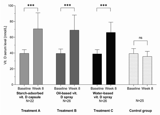 Serum 25-OH-VitD levels at baseline and after 8 weeks of vitamin D supplementation with three different vitamin D formulations in test groups in comparison to control group; *** p < 0.0001 for change from baseline within group; ns: not significant.