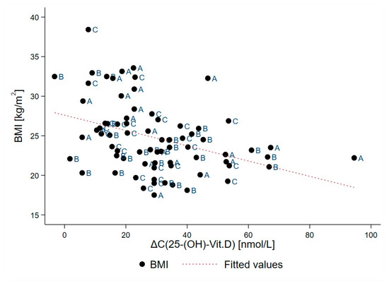 Pearson linear correlation of the treatment-related increase in serum 25-OH-VitD concentration (Δc; nmol/L) and body mass index (BMI; kg/m2) for subjects in all three treatment groups (A + B + C; N = 73; missing BMI value for one subject). A—capsules; B—oil-based spray; and C—water-based spray.