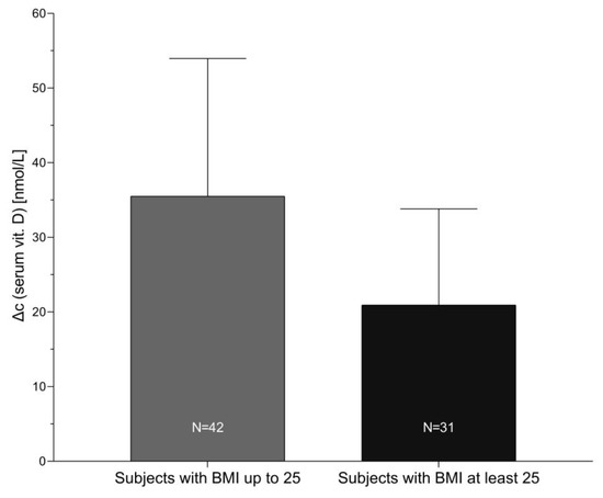 A plot of after-treatment increase in serum 25-OH-VitD concentration in correlation with body mass index is presented in Figure 5. Pearson linear correlation showed negative association (r = −0.385; p < 0.001) between increase in the serum 25-OH-VitD concentration and BMI. Sample segmentation showed mean increase in serum 25-OH-VitD concentration for 35.5 ± 18.5 nmol/L in subjects with BMI up to 25 kg/m2 (N = 43), while notable lower increase was found in obese/overweight subjects (21.0 ± 13.0 nmol/L; N = 31), as can be observed in Figure 6.