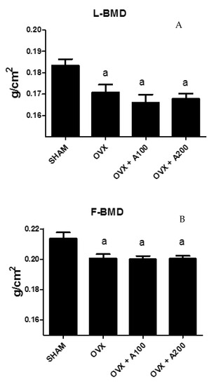 Lumbar bone mineral density (LBMD) (A) and femoral BMD (FBMD) (B) in a group of SHAM operated, ovariectomized (OVX), ovariectomized and treated with olive oil (OVX + 100) (100 µL/day by oral gavage), and ovariectomized and treated with olive oil (OVX + 200) (200 µL/day by oral gavage) over 3 months, n = 12. Data are expressed as mean ± SD. Statistical significance: (a) vs. SHAM. FBMD: OVX vs. SHAM p < 0.05, OVX + 100 vs. SHAM p < 0.05, OVX + 200 vs. SHAM p < 0.05. LBMD: OVX vs. SHAM p < 0.05, OVX + 100 vs. SHAM p < 0.01, OVX + 200 vs. SHAM p < 0.01.