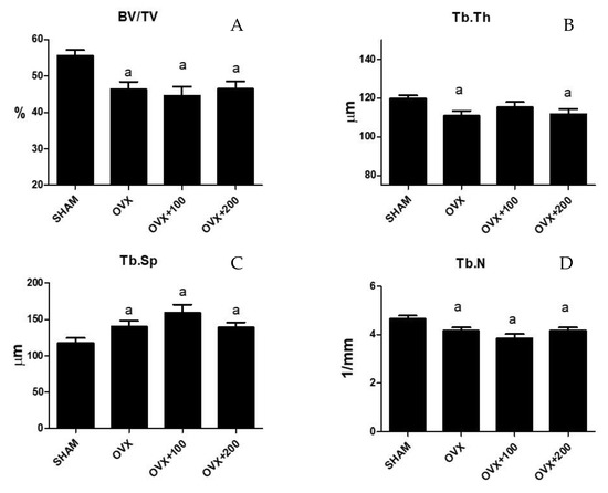 Femoral trabecular microarchitecture analysis: bone volume/total volume (BV/TV) (A), trabecular thickness (Tb.Th) (B), trabecular separation (Tb.Sp) (C), and trabecular number (Tb.N) (D). SHAM operated, ovariectomized (OVX), ovariectomized and treated with olive oil (OVX + 100) (100 µL/day by oral gavage) and ovariectomized and treated with olive oil (OVX + 200) (200 µL/day by oral gavage) over 3 months, n = 12. Data are expressed as mean ± SD. Statistical significance: (a) vs. SHAM. BV/TV: OVX vs. SHAM p < 0.01, OVX + 100 vs. SHAM p < 0.001, OVX + 200 vs. SHAM p < 0.001. Tb.Th: OVX vs. SHAM p < 0.01, OVX + 200 vs. SHAM p < 0.05. TbSp: OVX vs. SHAM p < 0.05, OVX + 100 vs. SHAM p < 0.01, OVX + 200 vs. SHAM p < 0.05. TbN: OVX vs. SHAM p < 0.05, OVX + 100 vs. SHAM p < 0.01, OVX + 200 vs. SHAM p < 0.05.