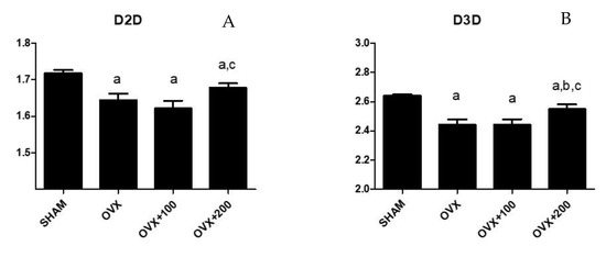 Figure 3 shows the values of D2D and D3D for the groups SHAM, OVX rats, and rats treated with 100 or 200 µL of VOO. The group of rats treated with 200 µL of VOO presented a higher value of D2D than that of OVX + 100 rats (p < 0.05) (1.69 ± 0.07 vs. 1.64 ± 0.02), although this D2D was lower than the SHAM group (1.72 ± 0.02) (p < 0.05). This same group of rats had a higher D3D value than the groups of OVX p < 0.05) and OVX + 100 rats (p < 0.05) though lower (p < 0.05) than the SHAM group. (D3 SHAM: 2.67 ± 0.03; D3 OVX: 2.4 ± 0.11; D3 OVX + 100: 2.4 ± 0.02; D3 OVX + 200: 2.55 ± 0.15).