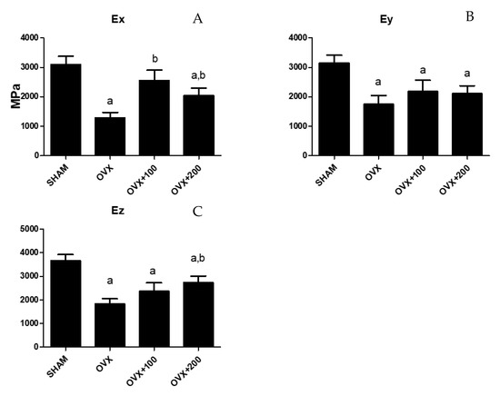 Young´s modulus of the femur obtained in three directions (Ex (A), Ey (B), Ez (C)). SHAM operated, ovariectomized (OVX), ovariectomized and treated with olive oil (OVX + 100) (100 µL/day by oral gavage) and ovariectomized and treated with olive oil (OVX + 200) (200 µL/day by oral gavage) over 3 months, n = 12. Data are expressed as mean ± SD. Statistical significance: (a) vs. SHAM; (b) vs. OVX. Ex: OVX vs. SHAM p < 0.001, OVX + 100 vs. OVX p < 0.05, OVX + 200 vs. SHAM p < 0.05, OVX + 200 vs. OVX p < 0.05. Ey: OVX vs. SHAM p < 0.01, OVX + 100 vs. SHAM p < 0.01, OVX + 200 vs. SHAM p < 0.01. Ez: OVX vs. SHAM p < 0.001, OVX + 100 vs. SHAM p < 0.01, OVX + 200 vs. SHAM p < 0.05, OVX + 200 vs. OVX p < 0.05.