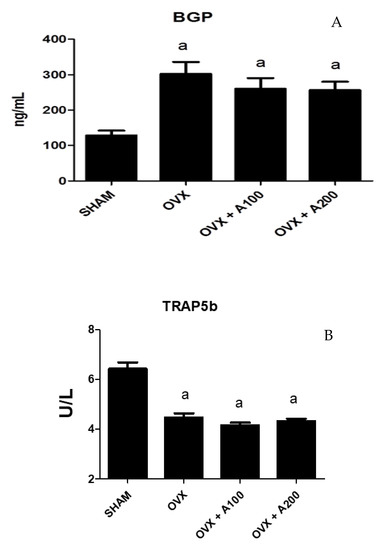 Serum osteocalcin (BGP) (A) and isoenzyme b of serum tartrate-resistant acid phosphatase (TRAP) (B). SHAM operated, ovariectomized (OVX), ovariectomized and treated with olive oil (OVX + 100) (100 µL/day by oral gavage) and ovariectomized and treated with olive oil (OVX + 200) (200 µL/day by oral gavage) over 3 months, n = 12. Data are expressed as mean ± SD. Statistical significance: (a) vs. SHAM; BGP: OVX vs. SHAM p < 0.001, OVX + 100 vs. SHAM p < 0.01, OVX + 200 vs. SHAM p < 0.001. TRAP: OVX vs. SHAM p < 0.001, OVX + 100 vs. SHAM p < 0.001, OVX + 200 vs. SHAM p < 0.001.