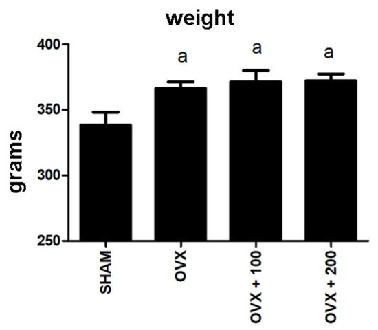 Weights at the end of the experiment. SHAM operated, ovariectomized (OVX), ovariectomized and treated with olive oil (OVX + 100) (100 µL/day by oral gavage) and ovariectomized and treated with olive oil (OVX + 200) (200 µL/day by oral gavage) over 3 months, n = 12. Data are expressed as mean ± SD. Statistical significance: (a) vs. SHAM; OVX vs. SHAM p < 0.05, OVX + 100 vs. SHAM p < 0.05, OVX + 200 vs. SHAM p < 0.01.