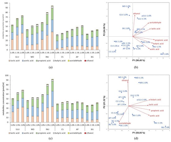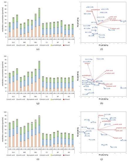 Metabolites concentration produced by probiotic strains, namely, (a) Lb. rhamnosus ŁOCK 1087, (c) Lb. paracasei ŁOCK 1091, (e) Lb. reuteri ŁOCK 1092, (g) Lb. plantarum ŁOCK 0860, and (i) Lb. pentosus ŁOCK 1094 in dependence on the used prebiotic (MD–maltodextrin, INU–inulin, CS–corn starch, AP–apple pectin, BG–β-glucan) or glucose (GLU) comparatively as a carbon source in the cultivation medium. Moreover, the correlations between used carbohydrates, as well as their concentrations, and the synthesized amount of metabolites, were presented as the PCA biplots, namely, plots (b,d,f,h,j) for above-mentioned strains, respectively.
