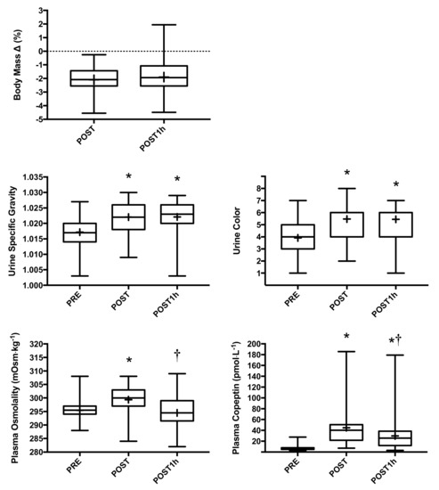 Hydration biomarkers were assessed for mean differences across time via One-Way Repeated Measures ANOVA or the Friedman test for normally and non-normally distributed data, respectively (whereas BMΔ was assessed via paired t-test due to its measurement at two versus three time points); in the event of a significant F statistic, Tukey’s or Dunn’s multiple comparisons tests were employed for normally and non-normally distributed data, respectively (Prism GraphPad 7).