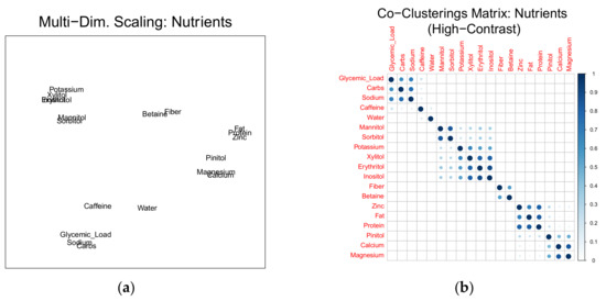 The 19 predictor variables were serially clustered via k-means, over a range of k values. The co-clusterings (on a scale of 0 to 1, representing the proportion of 2100 clustering iterations where any two nutrient pairs were observed in the same cluster) were converted to a pseudo-distance matrix (1 minus co-clustering frequency) and plotted in two-dimensions via multi-dimensional scaling (Figure 2a). For further clarity, the co-clusterings matrix was inspected for the proportion of cluster replicates where nutrient pairs were co-clustered (Figure 2b). The co-clustering matrix represents the frequency of co-clustering among nutrients where a large dark circle indicates a co-clustering frequency near 100%, and a small light-blue circle indicates an infrequent co-clustering. In order to facilitate visualization and the process of manual extraction of clusterings among nutrients, this co-clustering matrix was raised to a large, odd-numbered power (set at 7), enhancing visual contrast.
