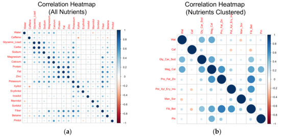 The two panels in Figure 2 were inspected for naturally occurring clusters. Nine clusters resulted: (1) Water, (2) Caffeine, (3) Glycemic Load + Carbohydrate + Sodium, (4) Magnesium + Calcium, (5) Protein + Fat + Zinc, (6) Potassium + Xylitol + Erythritol + Inositol, (7) Mannitol + Sorbitol, (8) Fiber + Betaine, and (9) Pinitol. The two panels in Figure 3 demonstrate second-order association, i.e., correlation between the nutrients before and after clustering.