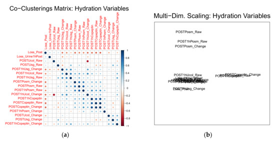 With regard to the clustering of hydration biomarkers, correlation analysis provided ambiguous results (Figure 4a); however, multi-dimensional scaling revealed three clusters: (1) Posm, (2) Pcop, and (3) all-other markers (Figure 4b). Within all four serialized measurements (Ucol, Usg, Posm, and Pcop), all three time-points clustered together in the multi-dimensional scaling view.