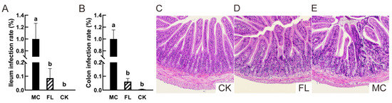 Escherichia coli O157 colonization and pathological section of ileum. (A) The colonization in ileum; (B) colonization in colon; (C) representative images of ileum tissue sections in the blank (CK) group (HE 100×); (D) representative images of ileum tissue sections in the FL group (HE 100×); (E) representative images of stained ileum tissue sections in the mode control (MC) group (HE 100×). Different letters (a, b) indicate significant differences among groups (p < 0.05).