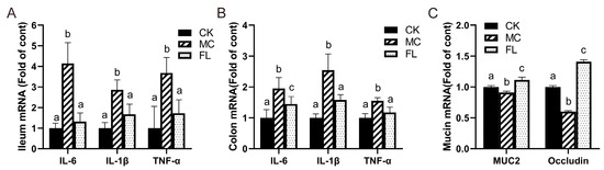Relative mRNA levels of inflammatory cytokines and mucins, all normalized to β-actin mRNA expression. (A) Inflammatory cytokines in ileum; (B) inflammatory cytokines in colon; (C) expression of mucin in colon. Different letters (a–c) indicate significant differences of the same factor among groups (p < 0.05).