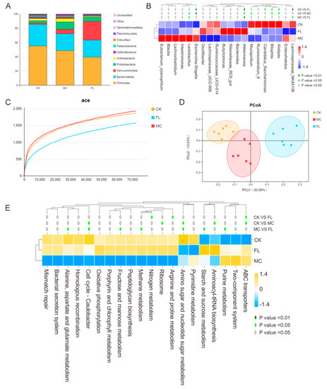 A dilution curve can be used to directly quantify species, and the height of the curve indirectly reflects the abundance of species. As shown in Figure 3C, species abundance in the CK group was similar to the MC group, which is in accordance with previous studies. However, that of the FL group was lower than for the other groups. Using PCoA analysis (Figure 3D), clusters between groups are obvious, among which species diversity in the MC g and CK groups were smaller. Consulting the SILVA database, in Level 2, functions of folding, sorting, and degradation declined in the MC group compared with the CK group, while the expression of pathways associated with cancer increased significantly (p < 0.01) according to the functional gene forecast. In the FL group, the endocrine system and digestive system abilities were noticeably weakened, while ABC transporters, arginine and proline metabolism, and nitrogen metabolism ability improved significantly (p < 0.05). The nitrogen metabolism ability was enhanced in the MC group compared to the CK group in Level 3 (Figure 3E) (p < 0.05). The FL group had a better performance in terms of methane metabolism; starch and sucrose metabolism; alanine, aspartate, and glutamate metabolism; amino sugar and nucleotide sugar metabolism; cell cycle—Caulobacter; fructose and mannose metabolism; and purine metabolism compared to the MC group.