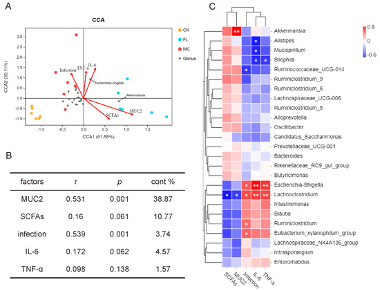 To research the correlation between gut microbiota and other sample indicators, we introduced an environment factors analysis and built a CCA model for microbiota samples and five main factors, including colon infection rates, overall amount of SCFAs, MUC2 expression and IL-6 and TNF-α expression in the colon. As shown in Figure 4A, CCA1 and CCA2 accounted for 61.58% and 30.11% of the whole microbiota variation, respectively; and the correlation, significance, and contribution of different factors are listed in Figure 4B. The result showed that MUC2 expression and the infection rate were highly significantly correlated with the distribution of gut microbiota. As seen from the correlations among species, Figure 4C shows that there was a significant positive correlation between Akkermansia and MUC2 expression (p < 0.001), and between Escherichia and infection rates and the presence of IL-6 and TNF-α (p < 0.01). Lachnoclostridium had similar results to Escherichia, and a significant negative correlation with SCFAs and MUC2 was also observed (p < 0.05).