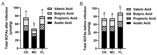 Total amount of short-chain fatty acids (SCFAs) in feces before and after infection. (A) Before infection; (B) after infection. Levels of different types of SCFAs are reflected. Different letters (a, b) are used to express significant differences between total SCFAs (p < 0.05).