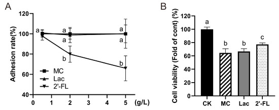 Cell vitality was determined following manufacturer’s instructions (alamarBlue, Beijing Solarbio Science & Technology Co., Ltd.) and results were similar to adhesion results (Figure 6B). When cells were supplemented with 5 g/L 2’-FL, the vitality was significantly higher than group with lactose intervention or the MC group without any intervention (p < 0.01). This demonstrates that certain concentrations of 2’-FL have a protective effect on cells against E. coli O157 infection.