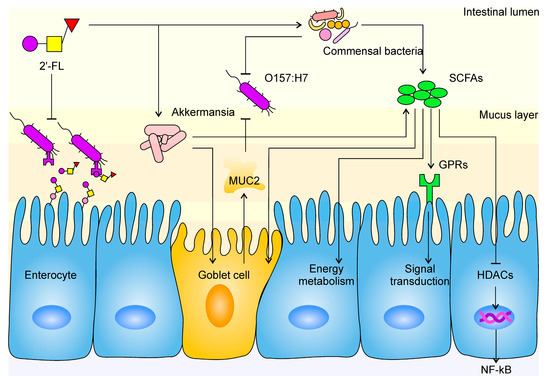 The mechanism of 2’-FL protection against E. coli O157 infection in the intestine. The tapered arrow indicates a promoting effect, while the flat end indicates an inhibiting effect. Mucoprotein-2, MUC2; short-chain fatty acids, SCFAs; histone deacetylases, HDACs; G protein-coupled receptors, GPRs; nuclear factor kappa-B, NF-κB.