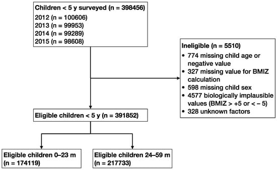 The sampling design of the VNSS has been described in detail elsewhere []. In short, the data are a nationally representative sample of children <5 y. Sample weights were calculated using population data from the 2009 Census []. Figure 1 shows the participant flow chart. Our analysis included 391,852 children <5 y surveyed annually between 2012 and 2015. The VNSS is an integral part of the 2011–2020 National Nutrition Strategy, which was approved by the Prime Minister of Vietnam in 2012 []. The National Institute of Nutrition’s Scientific and Ethical Committee and the Ministry of Health’s Scientific and Ethical Committee approved the current tools and methodology in 2009. All subjects gave their informed consent for inclusion before they participated in the study. The study was conducted in accordance with the Declaration of Helsinki, and the protocol was approved by the Ethics Committee of 318/VDD-CĐT.