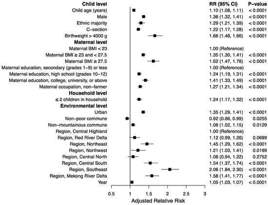 Among children <2 y, birthweight >4000 g was associated with a two-fold increase in risk (RR: 1.98; 95% CI: 1.69, 2.31) of overweight or obesity (Supplemental Figure S2). Most risk factors for children 2–5 y were higher in magnitude compared with their risk among all children <5 y, especially living in the Southeast (RR: 2.48; 95% CI: 2.12, 2.91), Mekong River Delta (RR: 1.78; 95% CI: 1.52, 2.09), or Central South (RR: 1.75; 95% CI: 1.48, 2.06) compared with the Central Highland, maternal BMI ≥27.5 (RR: 1.79; 95% CI: 1.59, 2.02) compared with BMI <23, maternal education at or above college or university level (RR: 1.56; 95% CI: 1.46, 1.56) compared with secondary education or less, and maternal occupation other than farmer (RR: 1.46; 95% CI: 1.36, 1.56) (Supplemental Figure S3).