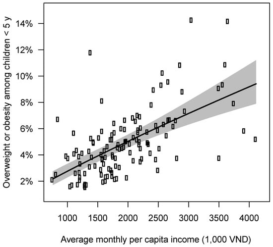 Many factors thus seem to contribute to changes in overweight or obesity [], and the impact of some of these factors may be complex. Rapid economic growth, for instance, has helped to substantially reduce the burden of undernutrition in Vietnam over the past few decades, but at the same time may have been accompanied by changes in food systems and lifestyles, including dietary preferences, that contribute to child overweight or obesity, although at a slower pace than in several other rapidly developing countries [,]. The proportion of the population living in urban areas increased sharply from 24% in 2000 to 36% in 2018 [] and may also be contributing to the increase in child overweight or obesity. Other factors may also be important, but there is limited empirical evidence on drivers of child overweight or obesity at the national level in Vietnam.