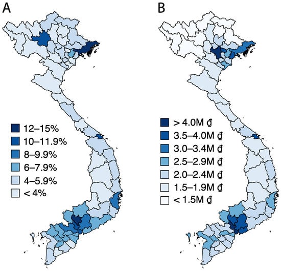 (A) Provincial level overweight or obesity prevalence among children <5 y in 2014. (B) Provincial level monthly per capita income in 2014 (in million VND).