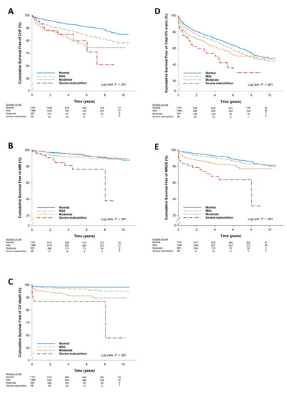 Cumulative survival free of events stratified by different nutritional categories based on Kaplan–Meier analysis: (A) congestive heart failure (CHF); (B) acute myocardial infarction (AMI); (C) cardiovascular death; (D) total cardiovascular events; (E) major adverse cardiovascular events (MACEs).